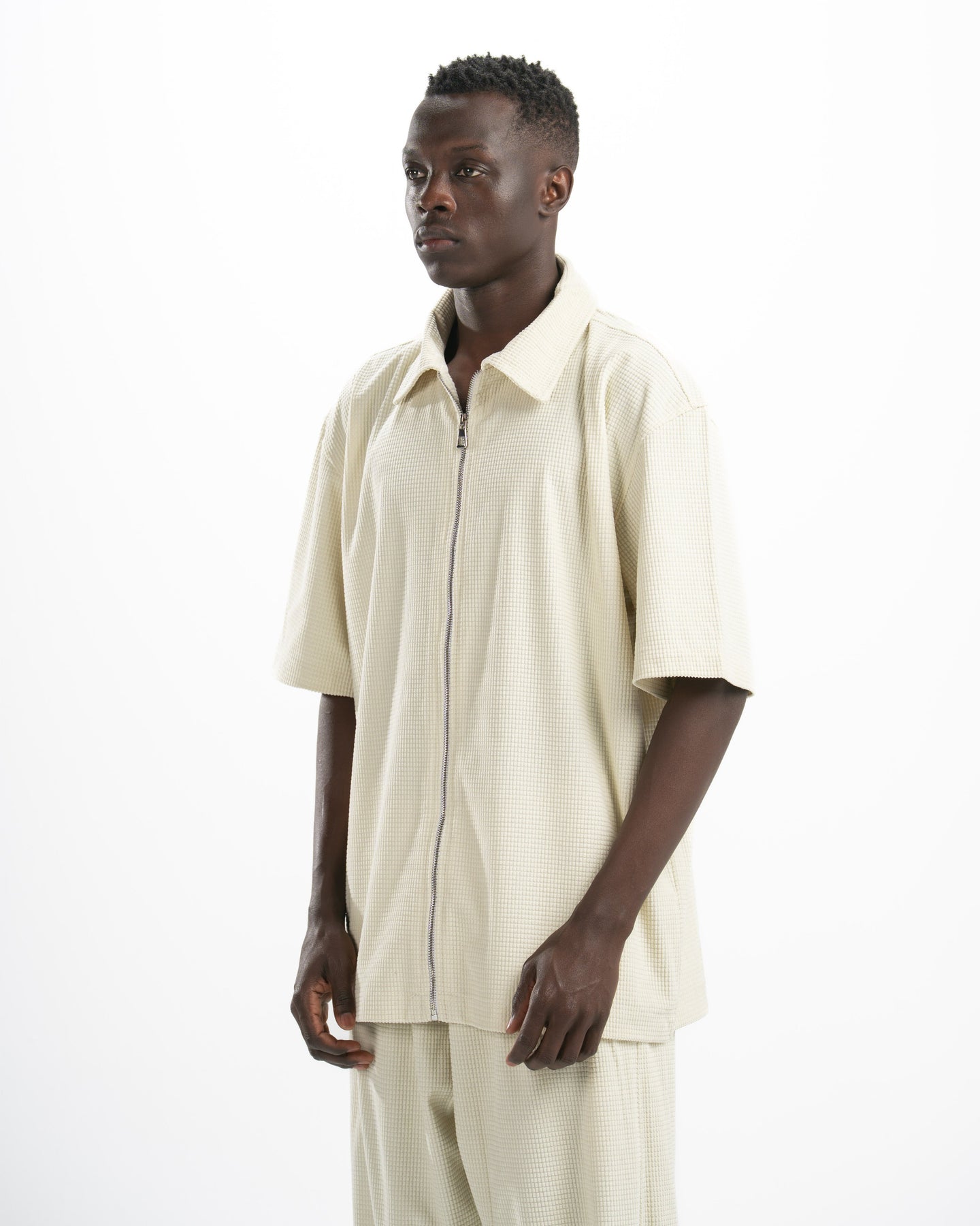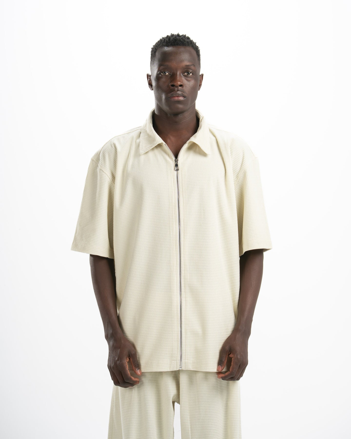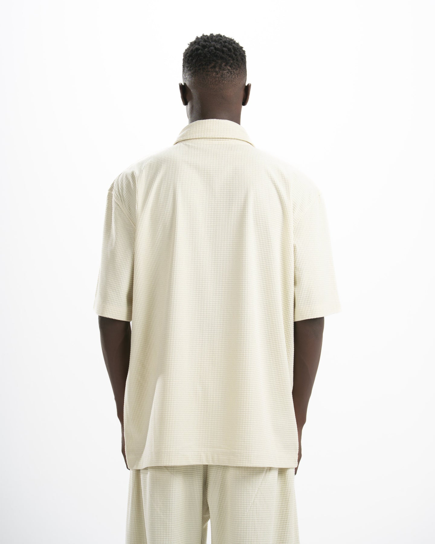 The Cream Waffle Shirt is cut in a relaxed fit with dropped shoulders and short sleeves — designed to layer or stand alone.