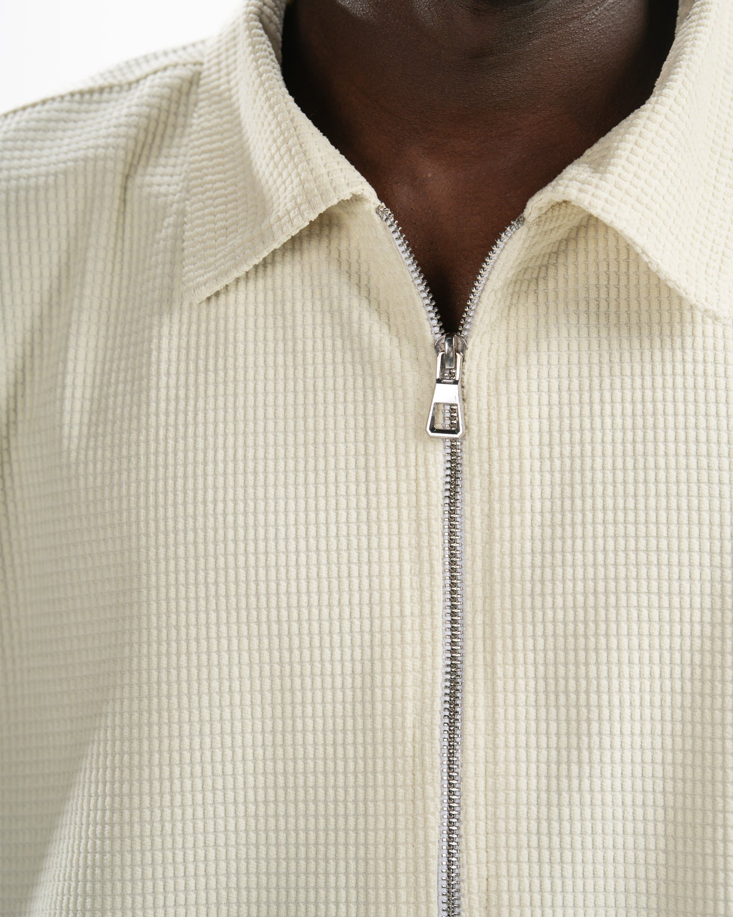 Crafted from a structured waffle-knit fabric that holds its shape without feeling stiff. The full-length zip and spread collar give it a utilitarian edge